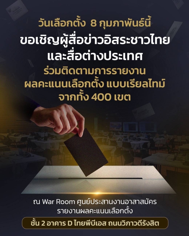 สมาคมทีวีดิจิทัล ร่วมกับเครือข่ายสื่อและภาคประชาชน เตรียมเปิด “วอร์รูมวันเลือกตั้ง” ศูนย์ประสานงานอาสาสมัครรายงานผลคะแนนเลือกตั้งแบบ Realtime จากทั้ง 400 เขตทั่วประเทศ ในวันเลือกตั้งวันที่ 8 กุมภาพันธ์นี้ ณ ชั้น 2 ห้องคอนเวนชันฮอลล์ อาคาร D ของ Thai PBS เพื่อเป็นศูนย์กลางการติดตามและรายงานผลคะแนนเลือกตั้งอย่างเป็นระบบ โปร่งใส และตรวจสอบได้