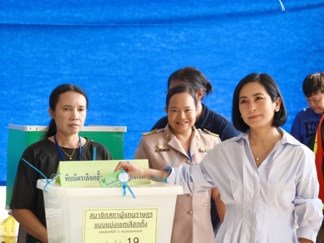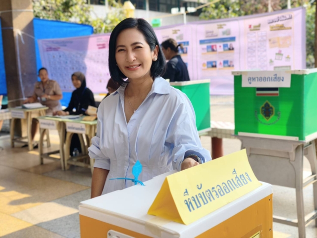 นางการดี เลียวไพโรจน์ รองหัวหน้าพรรคประชาธิปัตย์และแคนดิเดตนายกรัฐมนตรี เดินทางไปใช้สิทธิการเลือกตั้ง สส. และออกเสียงประชามติการจัดทำรัฐธรรมนูญฉบับใหม่ ที่โรงเรียนดลวิทยา ซอยศูนย์วิจัย เขตบางกะปิ กรุงเทพฯ ตั้งแต่ช่วงเช้าที่ผ่านมา