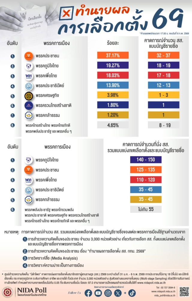 ศูนย์สำรวจความคิดเห็น “นิด้าโพล” สถาบันบัณฑิตพัฒนบริหารศาสตร์ (นิด้า) คาดการณ์ผลการเลือกตั้งสมาชิกสภาผู้แทนราษฎร (สส.) 2569
