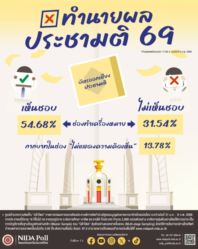 ศูนย์สำรวจความคิดเห็น “นิด้าโพล” สถาบันบัณฑิตพัฒนบริหารศาสตร์ (นิด้า) คาดการณ์ผลการออกเสียงประชามติการจัดทำร่างรัฐธรรมนูญแห่งราชอาณาจักรไทยฉบับใหม่ โดยทำการสำรวจระหว่างวันที่ 31 มกราคม – 6 กุมภาพันธ์ 2569 จากประชาชนที่มีอายุ 18 ปีขึ้นไป และมีสิทธิเลือกตั้ง กระจายทุกภูมิภาค ระดับการศึกษา อาชีพ และรายได้ ทั่วประเทศ รวมจำนวนทั้งสิ้น 2,895 หน่วยตัวอย่าง การสำรวจอาศัยการสุ่มตัวอย่างโดยใช้ความน่าจะเป็นจากบัญชีรายชื่อฐานข้อมูลตัวอย่างหลัก (Master Sample) ของ “นิด้าโพล” สุ่มตัวอย่างแบบหลายขั้นตอน (Multi-stage Sampling) โดยการเก็บข้อมูลด้วยวิธีการสัมภาษณ์ทางโทรศัพท์ และกำหนดค่าความคลาดเคลื่อนไม่เกิน 0.05 ที่ระดับความเชื่อมั่น ร้อยละ 97.0 ผลการสำรวจ ดังนี้