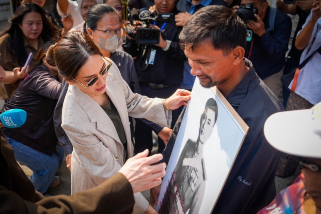 ทั้งนี้ ผู้สื่อข่าวรายงานเพิ่มเติมว่า ก่อนที่ น.ส.พินทองทา และนายณัฐพงศ์ จะเดินเข้าเรือนจำฯ ได้มีคนเสื้อแดงเป็นผู้ชาย เดินทางมาจากจังหวัดอ่างทอง พร้อมนำรูปภาพขนาดใหญ่ เป็นภาพสีขาวดำ ขนาดความสูงเกือบ 1 เมตร ซึ่งเป็นรูปภาพเดี่ยวของ นายทักษิณ ชินวัตร สมัยเป็นนักเรียนนายร้อยตำรวจ มามอบให้กับครอบครัวชินวัตร พร้อมเขียนข้อความสีแดงบนภาพ ว่า "ด้วยความห่วงใย ท่านพันตำรวจโท ดร.ทักษิณ ชินวัตร เป็นกำลังใจ 18 ปี ยังคอยได้ อีกสองเดือนกว่าคงไม่นาน รักและคิดถึง คิดถึงท่านเมื่อใด ก็อดร้องไห้ทุกทีเพราะสงสารท่าน ถ้าติดแทนท่านได้ จะติดแทนท่านเลย ขอเป็นกำลังใจสู้ ๆ จาก ลุงออด หมอกใหญ่ และน้องชายจรัญ" ซึ่งทาง น.ส.พินทองทา และนายณัฐพงศ์ ได้รับมอบเก็บไว้และขอบคุณจากหัวใจ