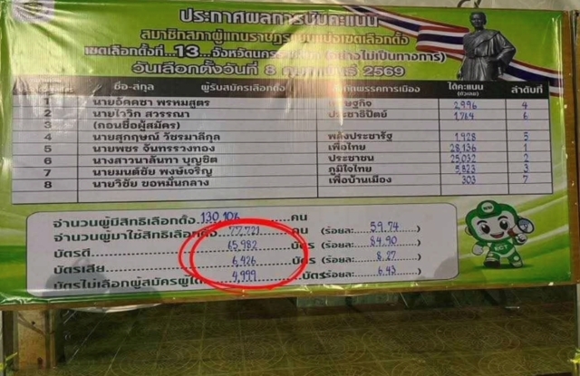 สาเหตุจากการตรวจสอบเอกสารผลการนับคะแนนอย่างไม่เป็นทางการ พบว่าตัวเลขผู้มาใช้สิทธิ์เลือกตั้งจำนวนบัตรดีและบัตรเสียมีความไม่สอดคล้องกัน โดยระบุว่ามีผู้มาใช้สิทธิ์ จำนวน 77,721 คน แต่เมื่อนำจำนวนบัตรดี และบัตรเสียรวมกันกลับได้เพียง 77,407 ใบ และยังพบว่ามีบัตรเสียสูงถึง 6,426 ใบ ซึ่งถือว่าอยู่ในระดับสูงผิดปกติ