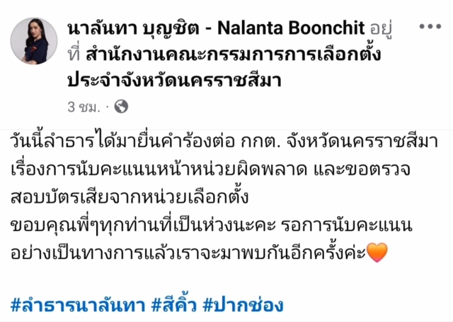 ด้านนางสาวนาลันทา ได้โพสต์ข้อความผ่านเพจส่วนตัว ระบุว่าได้เดินทางมายื่นคำร้องต่อ กกต.จังหวัดนครราชสีมา เพื่อขอให้ตรวจสอบความผิดพลาดในการนับคะแนนหน้าหน่วย และขอตรวจสอบบัตรเสีย พร้อมขอบคุณประชาชนที่ให้กำลังใจและแสดงความเป็นห่วง โดยขอรอผลการตรวจสอบและการนับคะแนนอย่างเป็นทางการจาก กกต.ต่อไป