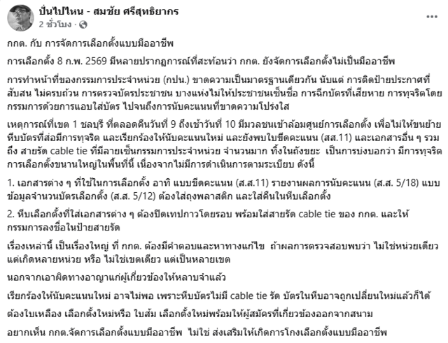 ล่าสุด นายสมชัย ศรีสุทธิยากร อดีตกรรมการการเลือกตั้ง (กกต.) ได้โพสต์ข้อความผ่านเฟซบุ๊กถึงกรณีนี้ว่า "กกต. กับ การจัดการเลือกตั้งแบบมืออาชีพ" การเลือกตั้ง 8 ก.พ. 2569 มีหลายปรากฏการณ์ที่สะท้อนว่า กกต. ยังจัดการเลือกตั้งไม่เป็นมืออาชีพ