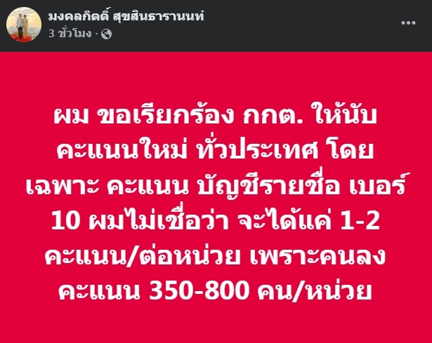 ล่าสุดนายมงคลกิตติ์ สุขสินธารานนท์ หรือ เต้ มงคลกิตติ์ แคนดิเดตนายกฯพรรคทางเลือกใหม่ ได้โพสต์ข้อความระบุว่า ผม ขอเรียกร้อง กกต.ให้นับคะแนนใหม่ทั่วประเทศ โดยเฉพาะ คะแนน บัญชีรายชื่อ เบอร์ 10 ผมไม่เชื่อว่า จะได้แค่ 1-2 คะแนน/ต่อหน่วย เพราะคนลงคะแนน 350-800 คน/หน่วย