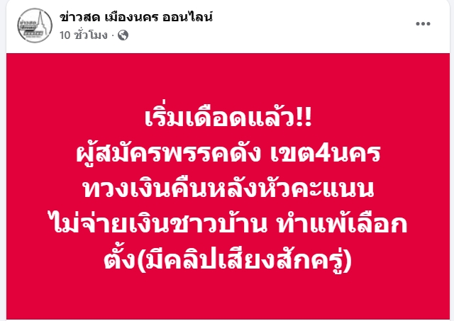 ผู้สื่อข่าวรายงานว่า เพจเฟซบุ๊ก ข่าวสด เมืองนคร ออนไลน์ โพสต์ข้อความเกี่ยวกับการเลือกตั้งในพื้นที่ว่า “เริ่มเดือดแล้ว!! ผู้สมัคร สส. พรรคดัง เขต 4 นครศรีธรรมราช (อำเภอเชียรใหญ่ อำเภอเฉลิมพระเกียรติ และ อำเภอชะอวด) ทวงเงินคืน หลังหัวคะแนนไม่จ่ายเงินชาวบ้าน ทำแพ้เลือกตั้ง”