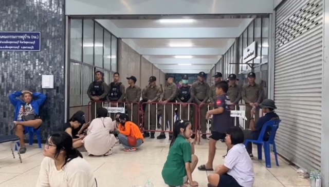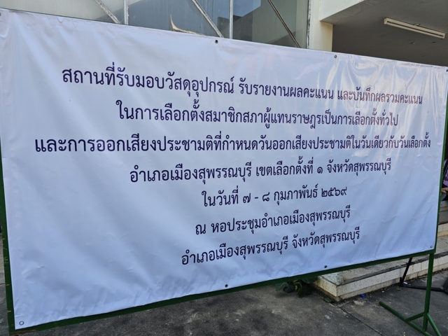 วันที่ 11 ก.พ. 69 บรรยากาศด้านหน้าหอประชุมอำเภอเมืองสุพรรณบุรี พื้นที่ภายในที่ว่าการอำเภอเมือง จังหวัดสุพรรณบุรี ซึ่งเป็นสถานที่เก็บหีบเลือกตั้งเฉพาะของเขต 1 ที่มีประชาชนมาเฝ้าติดตามตั้งแต่เมื่อคืน
