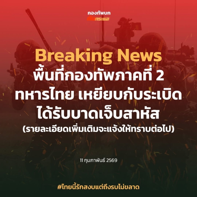 วันที่ 11 ก.พ. 69 เฟซบุ๊กเพจ “กองทัพบก ทันกระแส” โพสต์ข้อความระบุว่า “Breaking News พื้นที่กองทัพภาคที่ 2 ทหารไทย เหยียบกับระเบิด ได้รับบาดเจ็บสาหัส(รายละเอียดเพิ่มเติมจะแจ้งให้ทราบต่อไป) #ไทยนี้รักสงบแต่ถึงรบไม่ขลาด”