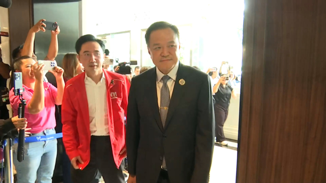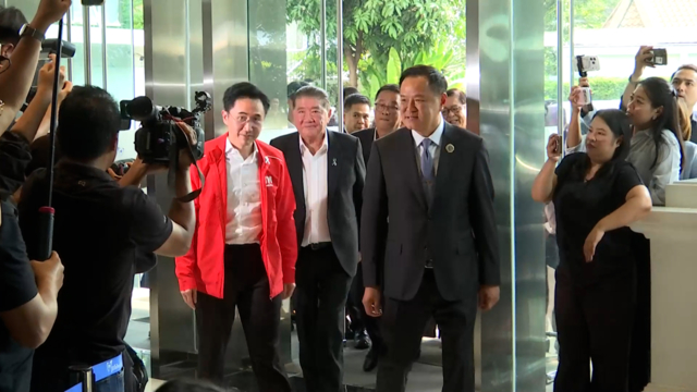 โดยในเวลา 14:57 น. นายอนุทิน พร้อมด้วยแกนนำเดินทางลงมาบริเวณด้านหน้าที่ทำการพรรคภูมิใจไทยเพื่อมาให้การต้อนรับพรรคเพื่อไทย นำโดยนายยศชนัน วงศ์สวัสดิ์ แคนดิเดตนายกรัฐมนตรีพรรคเพื่อไทย นายสุริยะ นายประเสริฐ และนายภูมิธรรม