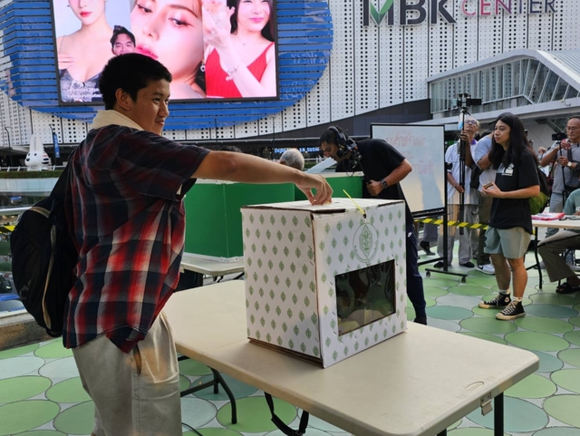 วันที่ 15 ก.พ. เวลา 17:00 น. กลุ่มภาคประชาชนได้เปิดการจัดกิจกรรมเชิงสัญลักษณ์ในการจัดการลงประชามติจำลองประเด็นการถอดถอน กกต. บนสกายวอร์คสี่แยกปทุมวัน โดยปรากฏว่ามีกลุ่มผู้ชุมนุมและประชาชนจำนวนไม่น้อย ต่างทยอยมาต่อแถวเพื่อเข้าร่วมกิจกรรมการออกเสียงลงประชามติจำลองดังกล่าว