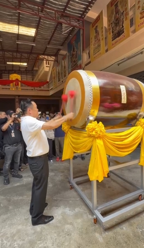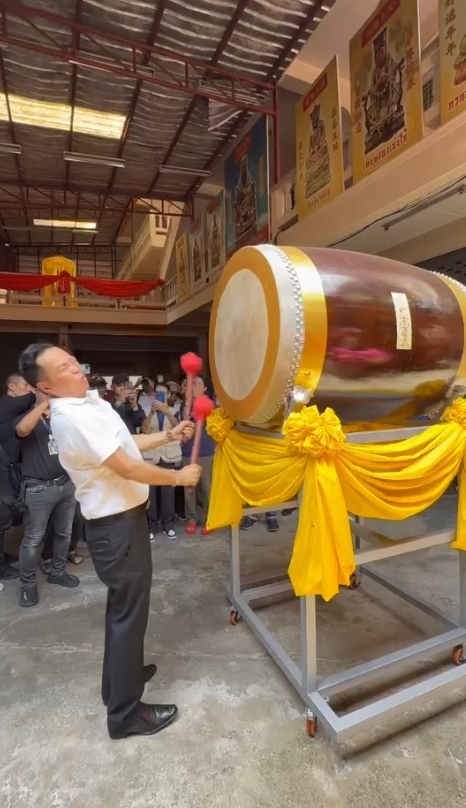 หลังกราบไหว้พระในศาลเจ้าเสร็จท่านก็ออกมาตีกลองประจำศาลเจ้า ท่ามกลางเสียงเชียร์ โดยนายอนุทิน โชว์สเต็ปตีกลอง แต่พลาดท่าไม้กลองฟาดเข้าหน้าตัวเองเต็มๆ