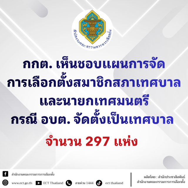 วันที่ 18 ก.พ. 69 สำนักงานคณะกรรมการการเลือกตั้ง เผยแพร่เอกสารข่าวประชาสัมพันธ์ว่า คณะกรรมการการเลือกตั้ง (กกต.) ได้มีมติเห็นชอบแผนการจัดการเลือกตั้งสมาชิกสภาเทศบาลและนายกเทศมนตรี กรณีอบต. จัดตั้ง เป็นเทศบาลตำบลและเทศบาลเมือง จำนวนทั้งสิ้น 297 แห่ง เพื่อให้การดำเนินการจัดการเลือกตั้งเป็นไปตามบทบัญญัติแห่งพระราชบัญญัติการเลือกตั้งสมาชิกสภาท้องถิ่นหรือผู้บริหารท้องถิ่น พ.ศ. 2562 และที่แก้ไขเพิ่มเติม มาตรา 12