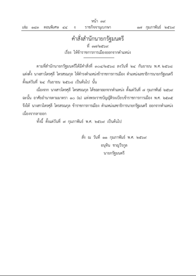 เมื่อวันที่ 17 กุมภาพันธ์ 2569 ที่ผ่านมา เว็บไซต์ราชกิจจานุเบกษา เผยแพร่คำสั่งสำนักนายกรัฐมนตรี ที่ 37/2569 เรื่อง ให้ข้าราชการการเมืองออกจากตำแหน่ง มีเนื้อหาว่า ตามที่สำนักนายกรัฐมนตรีได้มีคำสั่งที่ 304/2568 ลงวันที่ 24 กันยายน พ.ศ. 2568 แต่งตั้ง นางสาวไตรศุลี ไตรสรณกุล ให้ดำรงตำแหน่งข้าราชการการเมือง ตำแหน่งเลขาธิการนายกรัฐมนตรี ตั้งแต่วันที่ 24 กันยายน 2568 เป็นต้นไป นั้น