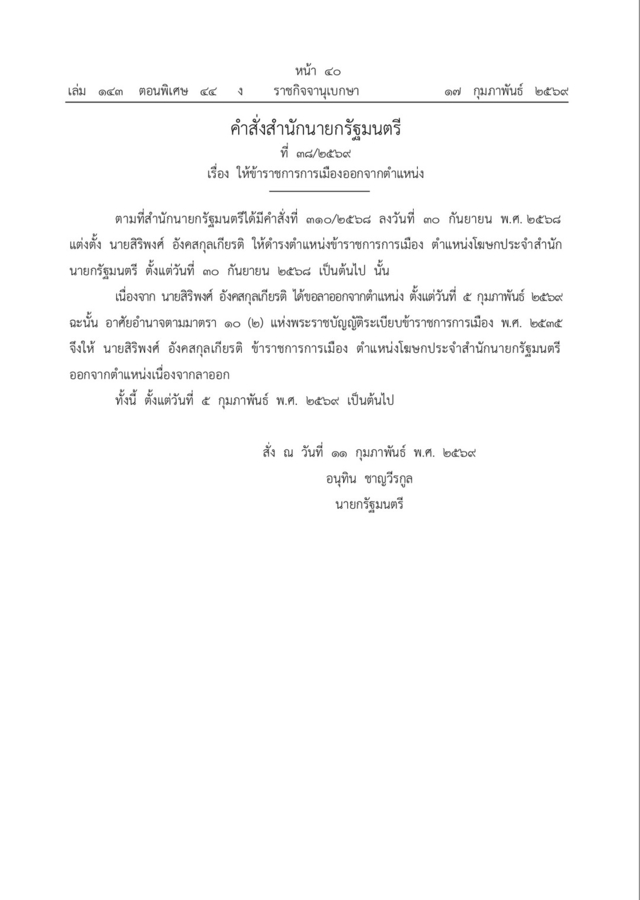 คำสั่งที่ 38/2569 มีเนื้อหาว่า ตามที่สำนักนายกฯ ได้มีคำสั่งที่ 310/2568 ลงวันที่ 30 ก.ย.2568 แต่งตั้ง นายสิริพงศ์ อังคสกุลเกียรติ ให้ดำรงตำแหน่งข้าราชการการเมือง ตำแหน่งโฆษกประจำสำนักนายกรัฐมนตรี ตั้งแต่วันที่ 30 ก.ย.2568 เป็นต้นไปนั้น