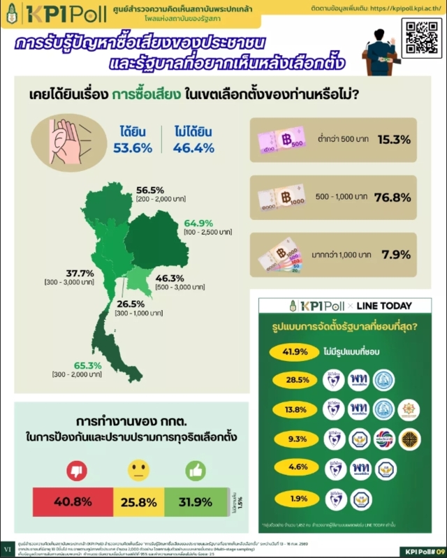 วันที่ 20 ก.พ. 69 นาย อิสระ เสรีวัฒนวุฒิ เลขาธิการสถาบันพระปกเกล้า ในฐานะผู้อํานวยการศูนย์ KPI Poll เปิดเผยว่า สถาบันพระปกเกล้าได้สํารวจครั้งที่9 เรื่อง “การรับรู้ปัญหาซื้อเสียงของประชาชน และรัฐบาลที่อยากเห็นหลังเลือกตั้ง” สํารวจระหว่างวันที่ 13-16 ก.พ. 69 จากประชาชนที่มีอายุ 18 ปีขึ้นไป กระจายตามภูมิภาคทั่วประเทศ จํานวน 2,000 ตัวอย่าง ดังนี้