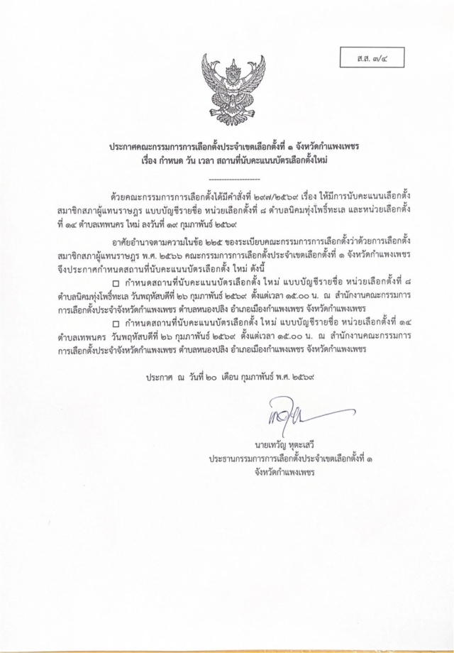 โดยล่าสุดเพจสำนักงานคณะกรรมการการเลือกตั้งประจำจังหวัดกำแพงเพชรได้โพสต์ประกาศวันนับคะแนนใหม่ในวันพฤหัสบดีที่ 26 กุมภาพันธ์ 2569 เวลา 15.00 น.ที่ สนง.กกต.กำแพงเพชร และวันที่ 25 กุมภาพันธ์ 2569 เวลา 15.00 น. จะเชิญสื่อมวลชนและผู้ที่เกี่ยวข้องรวมถึงตัวแทนจากพรรคการเมืองร่วมสังเกตการณ์ครั้งนี้ให้เป็นไปโดยสุจริตและเที่ยงธรรม