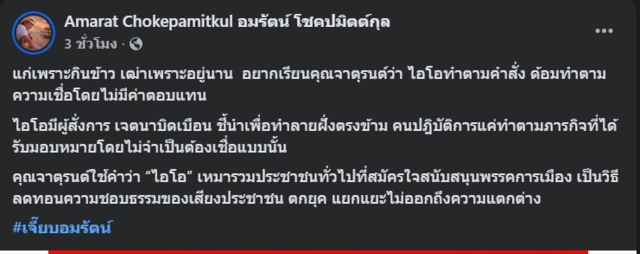 ขณะที่นาง อมรัตน์ โชคปมิตต์กุล อดีต สส.บัญชีรายชื่อ พรรคก้าวไกล ได้แชร์โพสต์ดังกล่าว พร้อมข้อความลงในเฟซบุ๊กเพจ “Amarat Chokepamitkul อมรัตน์ โชคปมิตต์กุล” ระบุว่า “แก่เพราะกินข้าว เฒ่าเพราะอยู่นาน อยากเรียนคุณจาตุรนต์ว่า ไอโอทำตามคำสั่ง ด้อมทำตามความเชื่อโดยไม่มีค่าตอบแทน”