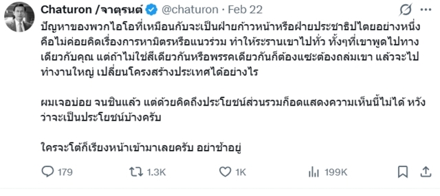 วันที่ 24 ก.พ. 69 นาย จาตุรนต์ ฉายแสง แกนนำพรรคเพื่อไทย โพสต์ข้อความลงในแอปพลิเคชัน “X” ว่า “ปัญหาของพวกไอโอที่เหมือนกับจะเป็นฝ่ายก้าวหน้า หรือฝ่ายประชาธิปไตยอย่างหนึ่งคือ ไม่ค่อยคิดเรื่องการหามิตร หรือแนวร่วม ทำให้ระรานเขาไปทั่ว ทั้งๆ ที่เขาพูดไปทางเดียวกับคุณ แต่ถ้าไม่ใช่สีเดียวกันหรือพรรคเดียวกันก็ต้องแซะต้องถล่มเขา แล้วจะไปทำงานใหญ่ เปลี่ยนโครงสร้างประเทศได้อย่างไร”