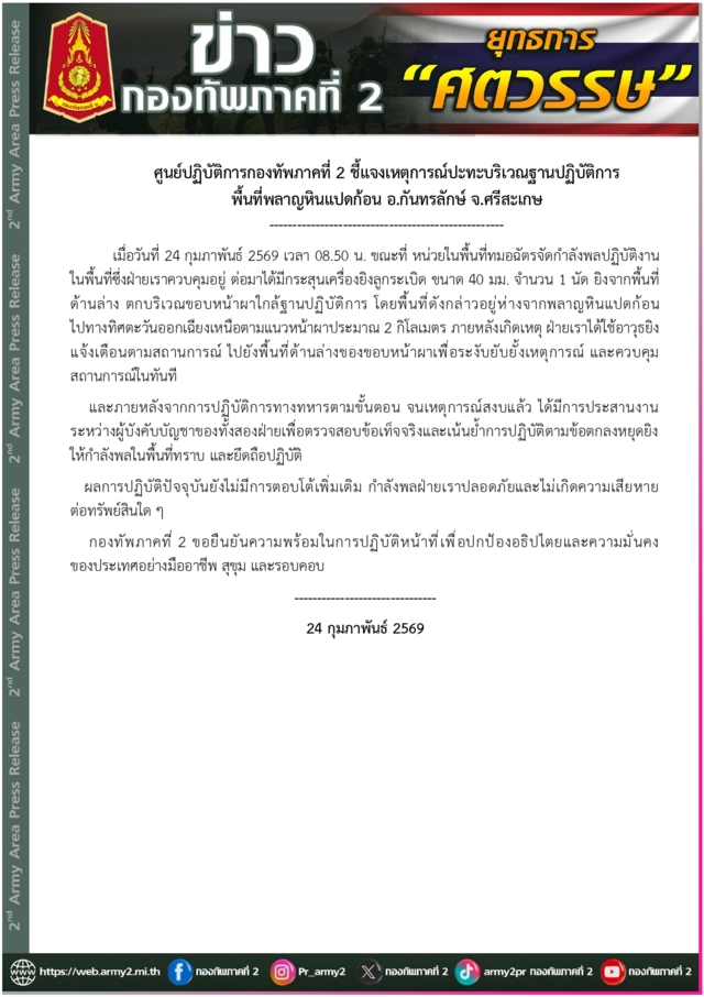 วันที่ 24 ก.พ. 69 เฟซบุ๊กเพจ “กองทัพภาคที่ 2” โพสต์เอกสารชี้แจงเหตุการณ์ปะทะบริเวณฐานปฏิบัติการพื้นที่พลาญหินแปดก้อน อ.กันทรลักษ์ จ.ศรีสะเกษว่า