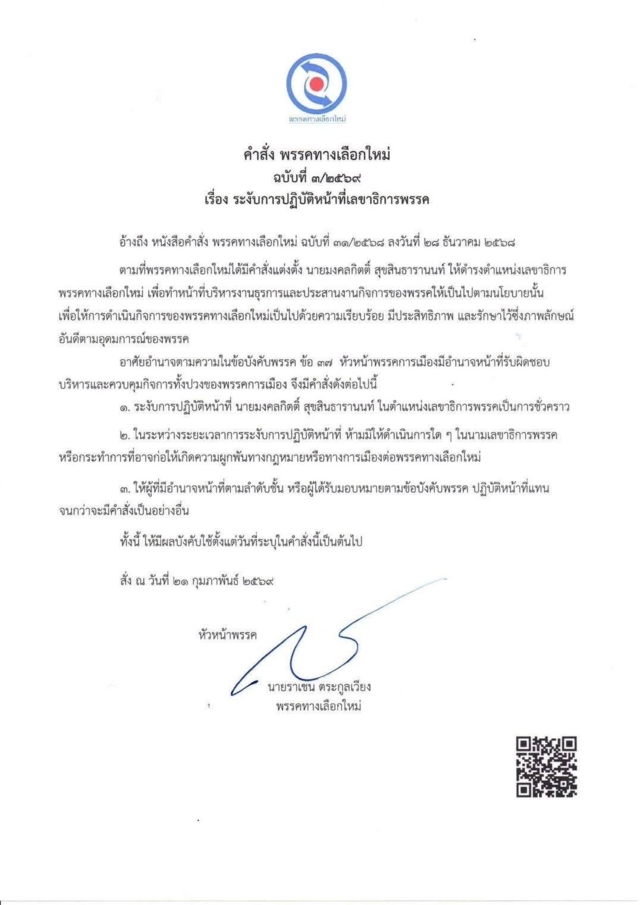 ทั้งนี้ คำสั่งดังกล่าวมีผลตั้งแต่วันที่ระบุในคำสั่ง วันที่ 21 ก.พ.69 เป็นต้นไป ลงนามโดย นายราเชน ตระกูลเวียง หัวหน้าพรรคทางเลือกใหม่