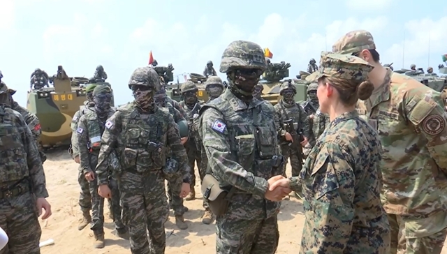 ต่อมาเวลา 10.30 น. กำลังพลระลอกแรกเข้าถึงชายหาด โดยใช้ยานสะเทินน้ำสะเทินบก AAV จากเกาหลีใต้ 2 คัน และจากไทย 2 คัน ขณะเดียวกันเฮลิคอปเตอร์ลำเลียงของสหรัฐฯ จำนวน 2 ลำ ทำการลงจอดเพื่อนำกำลังพลขึ้นฝั่ง ก่อนจะบินกลับออกไป จากนั้นในระลอกที่สองเป็นการส่งกำลังพลนาวิกโยธินขึ้นฝั่งโดยไม่มีอากาศยานสนับสนุน