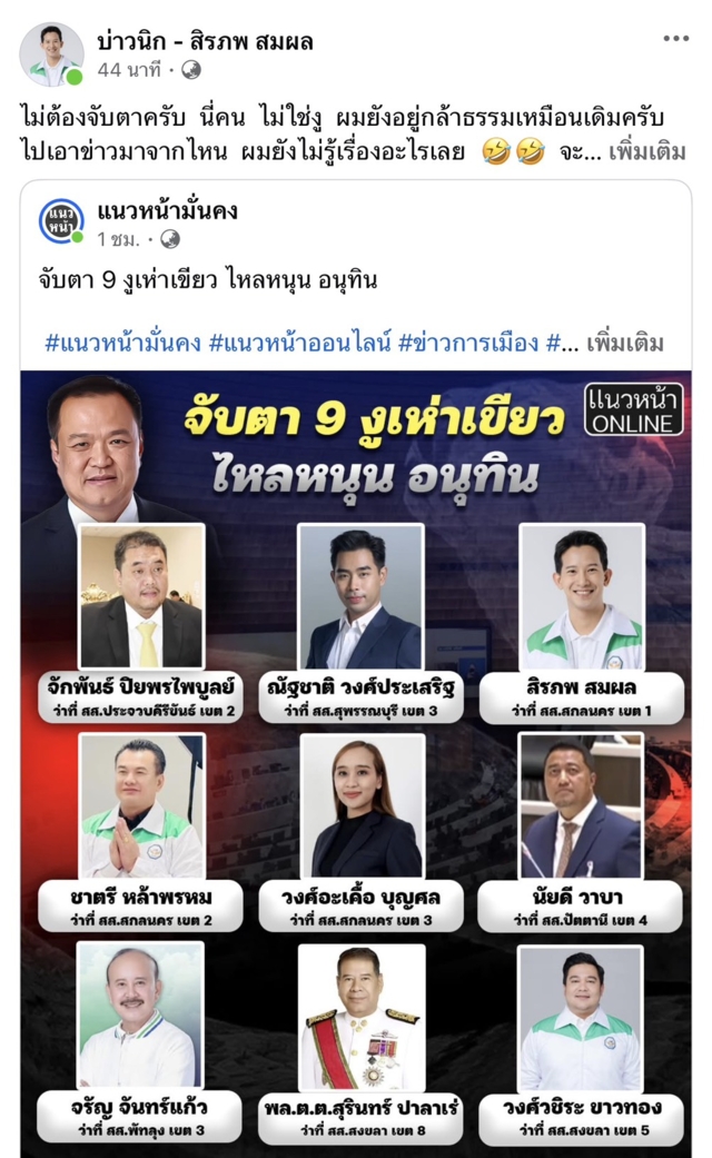 จากกรณีที่มีกระแสข่าว 9 สส.งูเห่า พรรคกล้าธรรม เตรียมสนับสนุนนายอนุทิน ชาญวีรกูล แคนดิเดตนายกฯ พรรคภูมิใจไทย ให้ดำรงตำแหน่งนายกฯ โดยจะแยกตัวออกจาก ร.อ.ธรรมนัส พรหมเผ่า ประธานที่ปรึกษาพรรคกล้าธรรม
