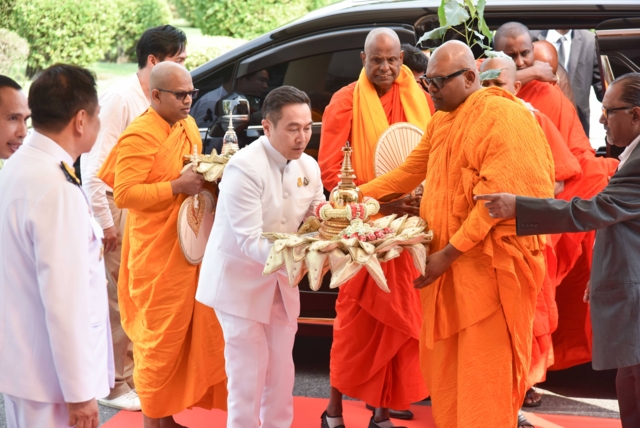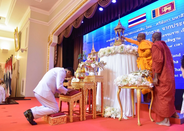 หลังจากนั้น ประธานสงฆ์ฝ่ายศรีลังกาและพระสงฆ์ศรีลังกาเจริญมงคลคาถา ให้พร กล่าวคำบูชาพระบรมสารีริกธาตุ สวดมนต์ เจริญจิตภาวนา และกล่าวคำอธิษฐานจิตเพื่อความเป็นสิริมงคลแก่ประเทศชาติและประชาชน ก่อนที่นายกรัฐมนตรีจะได้ถวายเครื่องไทยธรรมแด่พระสงฆ์จำนวน 7 รูป และกรวดน้ำและกราบลาประธานสงฆ์ทั้งสองฝ่าย ก่อนถ่ายภาพร่วมกับแขกผู้มีเกียรติ