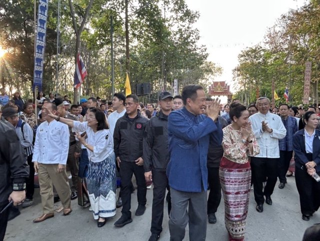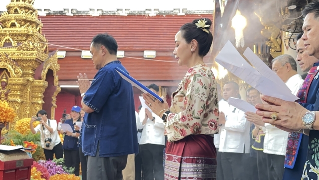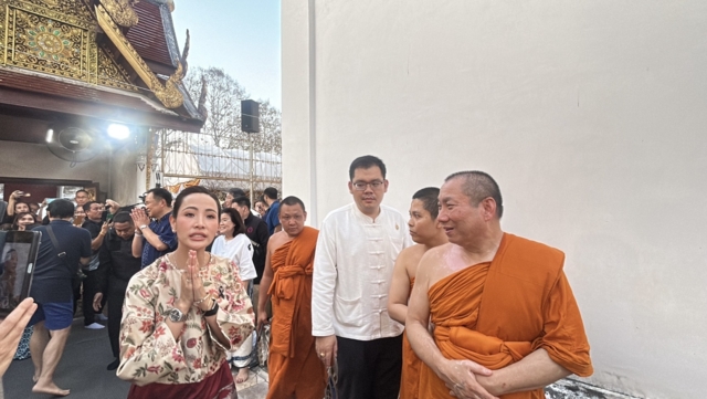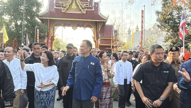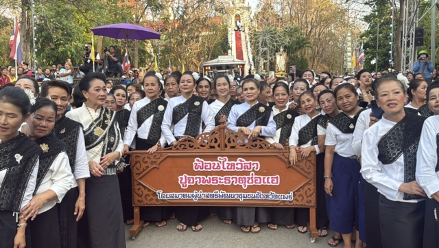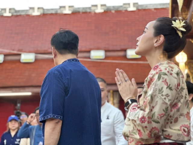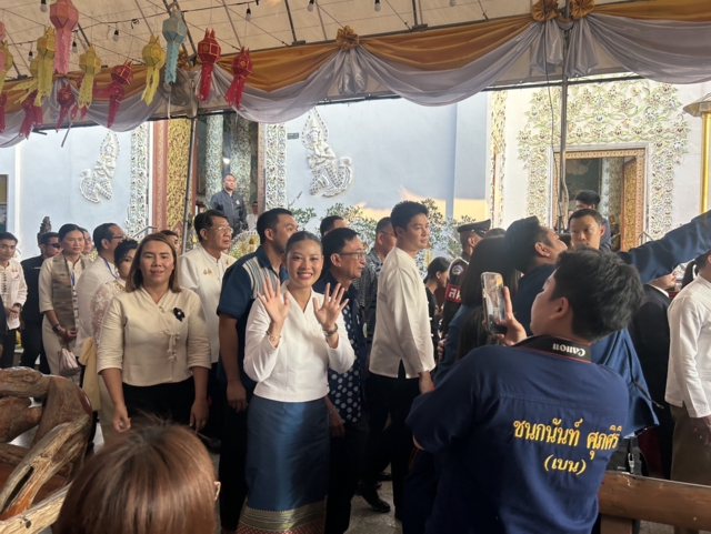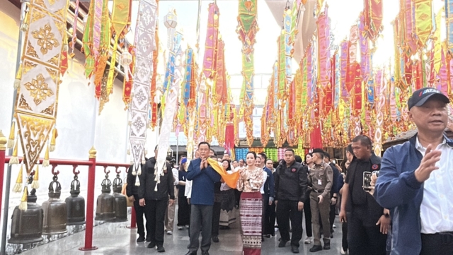 ต่อมา เวลา 17.32 น. นายกรัฐมนตรี ภริยา และคณะ เดินทางมาถึงวัดพระธาตุช่อแฮ โดยรถ Toyota Alphard 3 ขล 2499 กรุงเทพมหานคร โดยสวมเสื้อม่อฮ่อม พื้นเมือง โดยมีประชาชนสวมชุดพื้นเมือง“ผ้าม่อฮ่อม” และม่อฮ่อม ร่วมสมัย ที่ผสมผสานกับผ้าทอ ผ้าปัก มีความทันสมัย สวยงาม และคงเอกลักษณ์ของท้องถิ่น และมีนางสาวชนกนันท์ ศุภศิริ สส.แพร่ เขต 1 พรรคภูมิใจไทย นายชนาธิป ศุภศิริ สส.แพร่ เขต 2 พรรคภูมิใจ รวมถึงนางศิริวรรณ ปราศจากศัตรู หรือ “แม่เลี้ยงติ๊ก” ผู้สมัคร ส.ส. แบบบัญชีรายชื่อของพรรคภูมิใจไทย และอดีตสส.จังหวัดแพร่หลายสมัย รอต้อนรับ