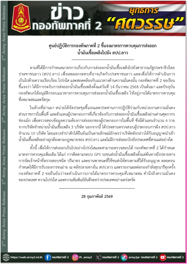 ล่าสุด (28 ก.พ. 2569) ศูนย์ปฏิบัติการกองทัพภาคที่ 2 ชี้แจงมาตรการควบคุมการส่งออก น้ำมันเชื้อเพลิงไปยัง สปป.ลาว ตามที่ได้มีการกำหนดมาตรการเกี่ยวกับการส่งออกน้ำมันเชื้อเพลิงไปยังสาธารณรัฐประชาธิปไตยประชาชนลาว (สปป.ลาว) เพื่อลดผลกระทบที่อาจเกิดกับประชาชนลาว และเพื่อให้การดำเนินการเป็นไปด้วยความเรียบร้อย โปร่งใส และสอดคล้องกับแนวทางด้านความมั่นคงนั้น กองทัพภาคที่ 2 ขอเรียนชี้แจงว่า ได้มีการระงับการส่งออกน้ำมันเชื้อเพลิงตั้งแต่วันที่ 14 ธันวาคม 2568 เป็นต้นมา และปัจจุบันกองทัพบกได้อนุมัติกรอบแนวทางการควบคุมการส่งออกน้ำมันเชื้อเพลิง ให้อยู่ภายใต้มาตรการควบคุมที่เหมาะสมและรัดกุม