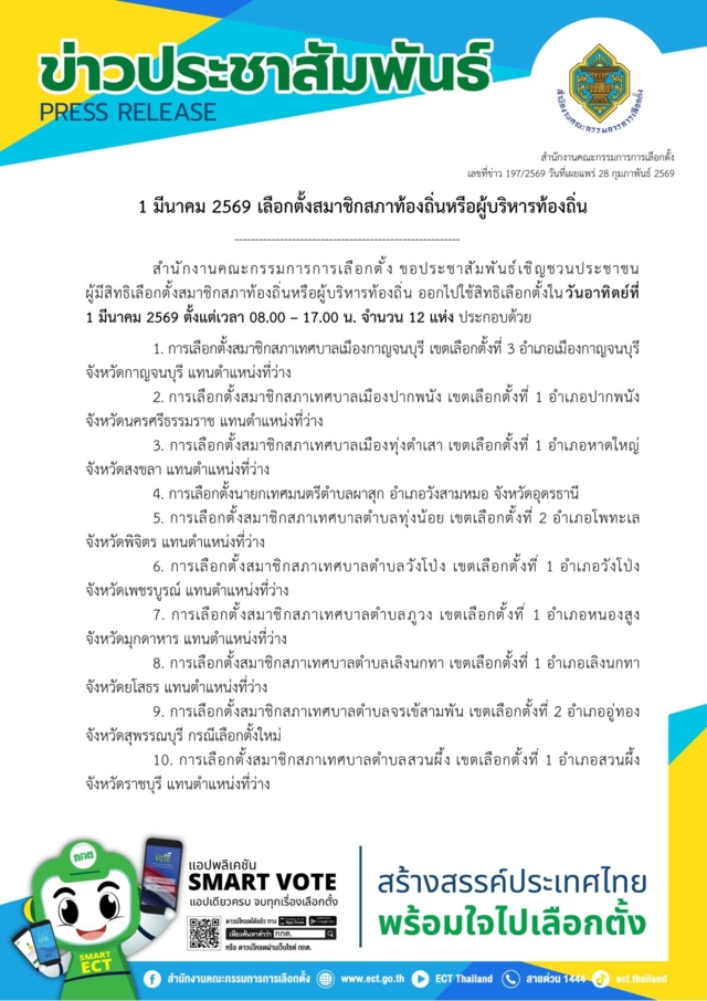 สำนักงานคณะกรรมการการเลือกตั้ง ขอประชาสัมพันธ์เชิญชวนประชาชน ผู้มีสิทธิเลือกตั้งสมาชิกสภาท้องถิ่นหรือผู้บริหารท้องถิ่น ออกไปใช้สิทธิเลือกตั้งในวันอาทิตย์ที่ 1 มีนาคม 2569 ตั้งแต่เวลา 08.00 - 17.00 น. จำนวน 12 แห่ง ประกอบด้วย