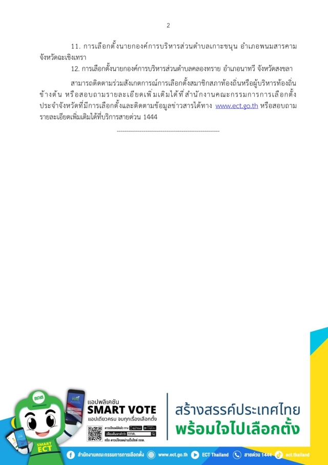 สามารถติดตามร่วมสังเกตการณ์การเลือกตั้งสมาชิกสภาท้องถิ่นหรือผู้บริหารท้องถิ่นข้างต้น หรือสอบถามรายละเอียดเพิ่มเติมได้ที่สำนักงานคณะกรรมการการเลือกตั้ง ประจำจังหวัดที่มีการเลือกตั้งและติดตามข้อมูลข่าวสารได้ทาง www.ect.go.th หรือสอบถามรายละเอียดเพิ่มเติมได้ที่บริการสายด่วน 1444