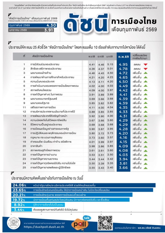 วันที่ 1 มี.ค.2569 สวนดุสิตโพล มหาวิทยาลัยสวนดุสิต สำรวจความคิดเห็นประชาชนทั่วประเทศ เรื่อง “ดัชนีการเมืองไทย ประจำเดือนกุมภาพันธ์ 2569” กลุ่มตัวอย่าง จำนวน 2,277 คน (สำรวจทางออนไลน์และภาคสนาม) ระหว่างวันที่ 24-27 กุมภาพันธ์ 2569 พบว่า กลุ่มตัวอย่างให้คะแนนภาพรวมดัชนีการเมืองไทยประจำเดือนกุมภาพันธ์ เฉลี่ย 4.30 คะแนน เพิ่มขึ้นจากเดือนมกราคม 2569 ที่ได้ 3.91 คะแนน ตัวชี้วัดที่ได้คะแนนสูงสุด คือ การมีส่วนร่วมของประชาชน ได้คะแนนเฉลี่ย 4.95 คะแนน ตัวชี้วัดที่ได้คะแนนต่ำสุด คือการแก้ปัญหายาเสพติดและผู้มีอิทธิพล ได้คะแนนเฉลี่ย 3.66 คะแนน ทั้งนี้ความเห็นต่อการเมืองไทย ณ วันนี้ คือ หวังว่ารัฐบาลใหม่จะบริหารประเทศได้ดี ช่วยให้คนไทยรวยขึ้น ร้อยละ 24.06 รองลงมาคือ มองว่าการเมืองไทยยังคงเหมือนเดิม ได้นักการเมืองหน้าเดิม ไม่มีอะไรเปลี่ยนแปลง ร้อยละ 23.65 การเมืองไทยวุ่นวาย พรรคการเมืองแบ่งขั้วแบ่งฝ่าย ร้อยละ 20.21