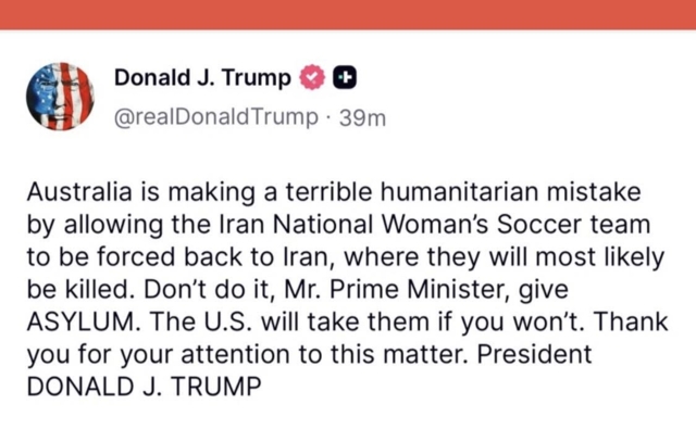 โดย ประธาธิบดี โดนัลด์ ทรัมป์ ของสหรัฐอเมริกา ระบุว่า "ออสเตรเลียกำลังตัดสินใจผิดพลาดอย่างร้ายแรงในด้านมนุษยธรรม ที่ยอมปล่อยให้ทีมฟุตบอลหญิงทีมชาติอิหร่านถูกบังคับให้กลับไปยังอิหร่าน ซึ่งพวกเธอมีโอกาสสูงมากที่จะถูกสังหาร อย่าทำแบบนั้นเลย ท่านนายกรัฐมนตรี โปรดมอบ ที่ลี้ภัย ให้แก่พวกเธอ หากท่านไม่รับไว้ สหรัฐอเมริกาจะรับพวกเธอไว้เอง ขอบคุณที่ท่านให้ความสำคัญกับเรื่องนี้ ประธานาธิบดี โดนัลด์ เจ. ทรัมป์"
