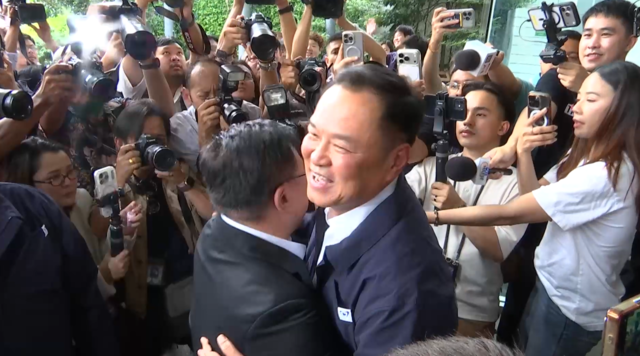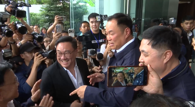 จากนั้นในเวลา 14.20 น. แกนนำพรรคเพื่อไทยนำโดยนายจุลพันธ์ อมรวิวัฒน์ หัวหน้าพรรคเพื่อไทย นายชูศักดิ์ ศิรินิล รองหัวหน้าพรรคเพื่อไทย และ นางสุดาวรรณ หวังศุภกิจโกศล รองหัวหน้าพรรคเพื่อไทย โดยทันทีที่มาถึง นายจุลพันธ์ได้ยกมือไหว้สวัสดีทักทายนายอนุทินและแกนนำที่มารอต้อนรับ ก่อนจะทำท่าทีตกใจแล้วร้องว่า "อุ้ย ท่านหัวหน้า" นายอนุทิน จึงกล่าวว่า "หนิม หนูมารอหนิมตั้งนาน" ก่อนจะหัวเราะ เข้าสวมกอดกัน และกอดคอนายจุลพันธ์พาเดินเข้าพรรค