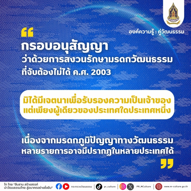 “กระทรวงวัฒนธรรมขอยืนยันว่า การขึ้นทะเบียนมรดกภูมิปัญญาทางวัฒนธรรมที่จับต้องไม่ได้ เป็นกระบวนการเพื่อการคุ้มครองและสืบสานมรดกวัฒนธรรมของมนุษยชาติ มิใช่การแข่งขันหรือการแสดงความเป็นเจ้าของระหว่างประเทศ”
