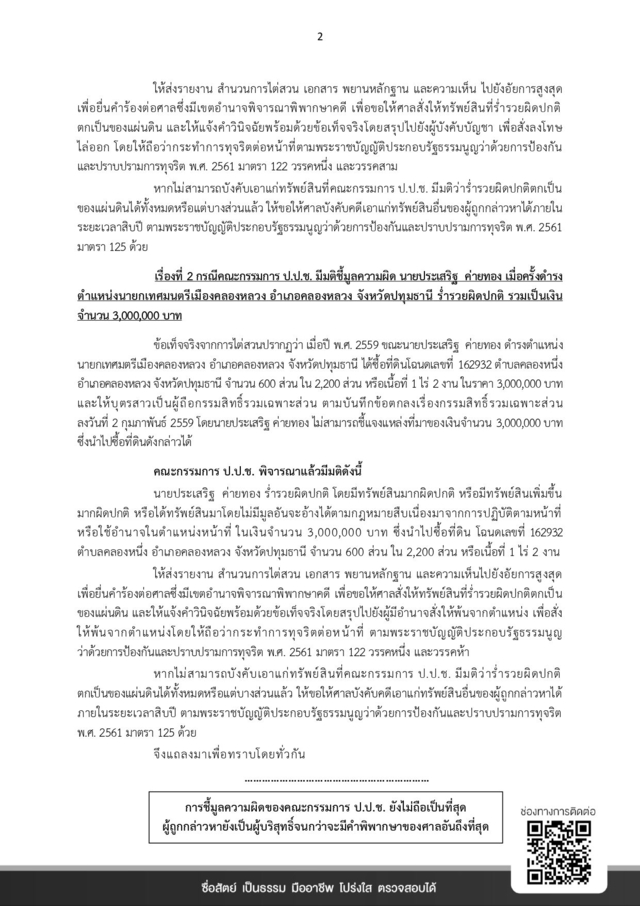 เรื่องที่ 2 กรณีคณะกรรมการ ป.ป.ช. มีมติชี้มูลความผิด นายประเสริฐ ค่ายทอง เมื่อครั้งดำรงตำแหน่งนายกเทศมนตรีเมืองคลองหลวง อำเภอคลองหลวง จังหวัดปทุมธานี ร่ำรวยผิดปกติ รวมเป็นเงินจำนวน 3,000,000 บาท