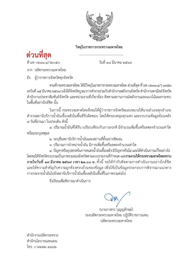 มหาดไทยสั่งด่วนที่สุดไปยังผู้ว่าฯและนายอำเภอทั่วประเทศ เร่งสำรวจสถานการณ์พลังงานเชื้อเพลิงย้อนหลัง 7 วันถึงปัจจุบัน เพื่อพิจารณาแนวทางการกระจายน้ำมัน