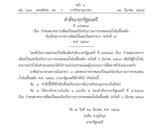 โดยที่เป็นการสมควรแก้ไขเพิ่มเติมคำสั่งนายกรัฐมนตรี ที่ 2/2569 เรื่อง กำหนดมาตรการเพื่อแก้ไขและป้องกันภาวะการขาดแคลนน้ำมันเชื้อเพลิง ลงวันที่ 6 มีนาคม 2569 เพื่อให้ผู้ค้าน้ำมันสามารถนำน้ำมันสำรองออกมาให้บริการแก่ประชาชนและผู้ประกอบการได้อย่างทั่วถึงและรวดเร็ว อาศัยอำนาจตามความในมาตรา 3 แห่งพระราชกำหนดแก้ไขและป้องกันภาวะการขาดแคลนน้ำมันเชื้อเพลิง พ.ศ.2516 นายกรัฐมนตรีมีคำสั่งไว้ ดังต่อไปนี้