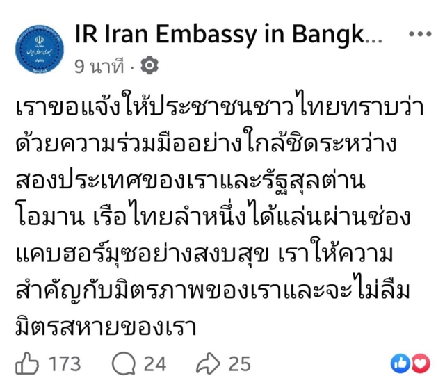 เพจเฟซบุ๊ก "IR Iran Embassy in Bangkok Thailand" (สถานเอกอัครราชทูตอิหร่าน) โพสต์ข้อความระบุว่า "เราขอแจ้งให้ประชาชนชาวไทยทราบว่า ด้วยความร่วมมืออย่างใกล้ชิดระหว่างสองประเทศของเราและรัฐสุลต่านโอมาน เรือไทยลำหนึ่งได้แล่นผ่านช่องแคบฮอร์มุซอย่างสงบสุข เราให้ความสำคัญกับมิตรภาพของเราและจะไม่ลืมมิตรสหายของเรา"