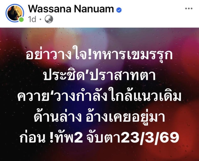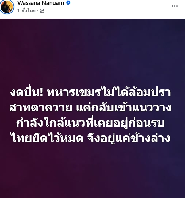 น.ส.วาสนา นาน่วม ผู้สื่อข่าวอาวุโสสายทหาร ได้โพสต์ข้อความผ่านเฟซบุ๊กส่วนตัว โดยระบุเนื้อหาสำคัญว่า งดปั่น! ทหารเขมรไม่ได้ล้อมปราสาทตาควาย แค่กลับเข้าแนววางกำลังใกล้แนวที่เคยอยู่ก่อนรบ ไทยยึดไว้หมด จึงอยู่แค่ข้างล่าง