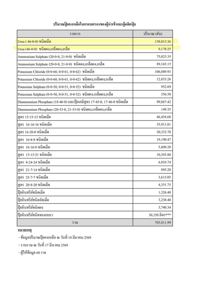 เมื่อวันที่ 26 มี.ค.2569 เวลา 17.30 น.นายไผ่ ลิกค์ สส.กำแพงเพชร พรรคกล้าธรรม โพสต์ข้อความพร้อมด้วยรูปภาพแสดงข้อมูลปริมาณปุ๋ยคงเหลือในครอบครองของผู้นำเข้าและผู้ผลิต ณ วันที่ 10 มีนาคม 2569 (รวบรวมเมื่อ 17 มีนาคม 2569 โดยนายไผ่ ระบุว่า ความจริงมีเพียงหนึ่งเดียว เราต้องบอกให้เกษตรกรเตรียมตัว ใครที่บอกว่า ปุ๋ยมีพอ มันเป็นเรื่องไม่จริง ปุ๋ยที่จะให้กับนาข้าวหลังต้นข้าวเริ่มโต เป็นปุ๋ย Urea (40-0-0) ก่อนสงกรานต์ก็ไม่น่าจะพอแล้ว