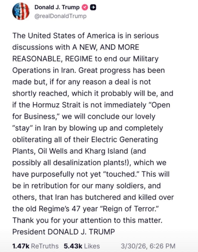 หากการเจรจาล้มเหลว ทรัมป์ขู่ว่าจะทำลายโครงสร้างพื้นฐานสำคัญของอิหร่านอย่างราบคาบ รวมถึง โรงไฟฟ้า, บ่อน้ำมัน, เกาะคาร์ก (ศูนย์กลางส่งออกน้ำมันหลัก) และ โรงงานผลิตน้ำจืด