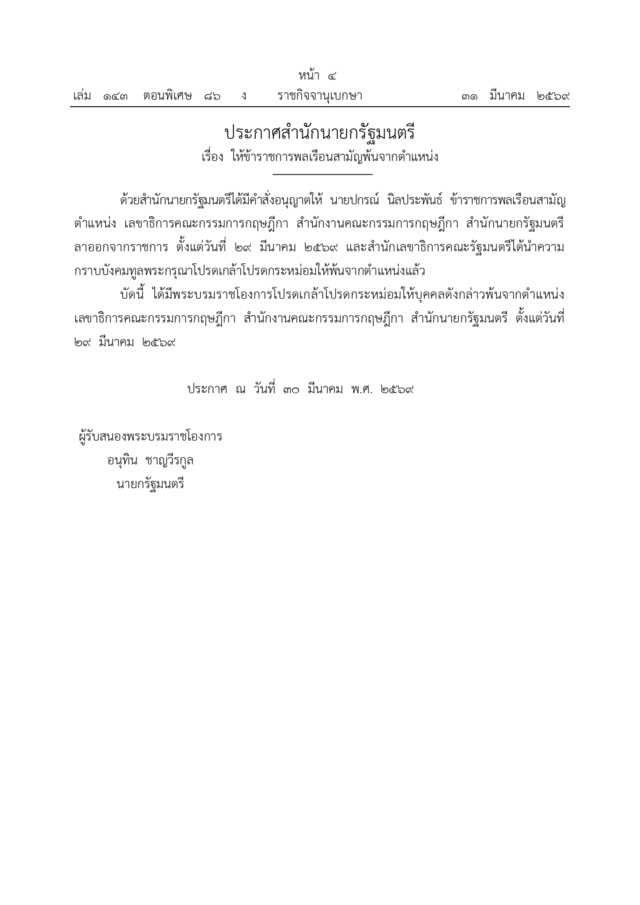 ด้วยสำนักนายกรัฐมนตรีได้มีคำสั่งอนุญาตให้ นายปกรณ์ นิลประพันธ์ ข้าราชการพลเรือนสามัญ ตำแหน่ง เลขาธิการคณะกรรมการกฤษฎีกา สำนักงานคณะกรรมการกฤษฎีกา สำนักนายกรัฐมนตรี ลาออกจากราชการ ตั้งแต่วันที่ 29 มีนาคม 2569 และสำนักเลขาธิการคณะรัฐมนตรีได้นำความ กราบบังคมทูลพระกรุณาโปรดเกล้าโปรดกระหม่อมให้พ้นจากตำแหน่งแหน่งแล้ว