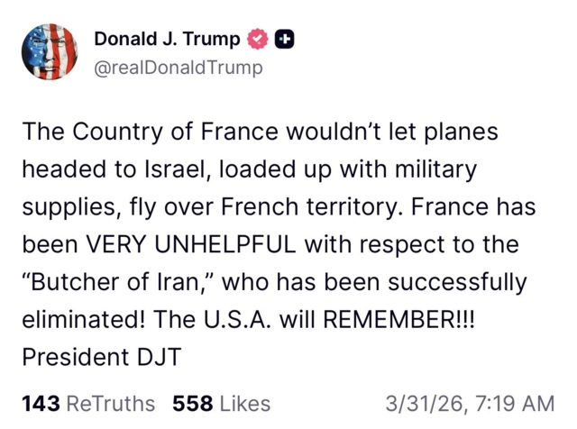 นายโดนัลด์ ทรัมป์ ประธานาธิบดีสหรัฐฯ ได้ออกมาบ่นเกี่ยวกับรายงานดังกล่าวบน Truth Social โดยอ้างว่าฝรั่งเศส "ไม่ให้ความช่วยเหลือ" เลยตลอดช่วงสงครามกับอิหร่าน และสหรัฐอเมริกาจะจดจำเรื่องนี้ไว้