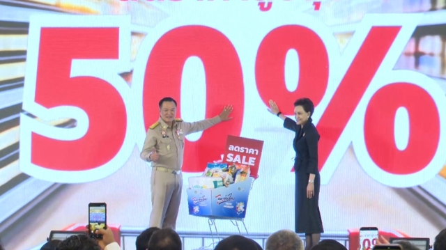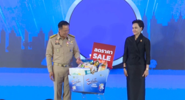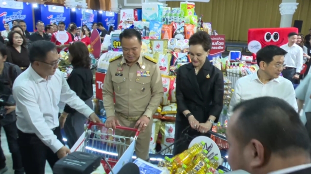 โดยภายหลังจะเป็นประธานเปิดโครงการ นายกรัฐมนตรี พร้อมด้วย นางศุภจี สุธรรมพันธุ์ รัฐมนตรีว่าการกระทรวงพาณิชย์ นายวุฒิไกร ลีวีระพันธุ์ ปลัดกระทรวงพาณิชย์ และนายพูนพงษ์ นัยนาภากรณ์ อธิบดีกรมพัฒนาธุรกิจการค้า ได้เดินเยี่ยมชมและซื้อสินค้าที่ผู้แทนนำมาจัดจำหน่ายภายในงาน อาทิ ข้าวสาร ไข่ไก่ ทิชชู่ สบู่อาบน้ำ ยาสระผม ถุงขยะ ผลไม้กระป๋อง บะหมี่กึ่งสำเร็จรูป ข้าวสาร และน้ำมันปาล์ม 12 ขวด ก่อนจะเข็นรถเข็นทั้งหมดขึ้นตึกไทยคู่ฟ้า