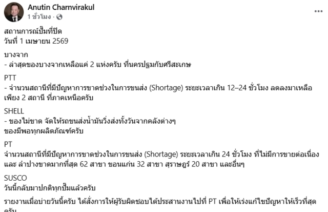 วันที่ 1 เม.ย.2569 เมื่อเวลา 15.55 น.นายอนุทิน ชาญวีรกูล นายกรัฐมนตรีและรมว.มหาดไทย โพสต์ข้อความผ่านเฟซบุ๊กถึงสถานการณ์ปั๊มน้ำมันที่ปิดในวันเดียวกันนี้ 5 ปั๊มใหญ่ โดยมีข้อความระบุว่า