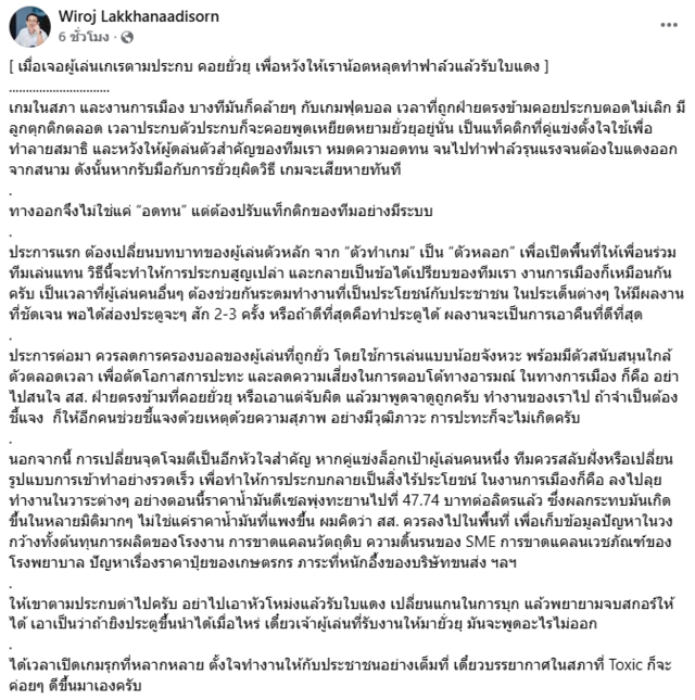 ล่าสุด (3 เม.ย. 2569) นายวิโรจน์ ลักขณาอดิศร รองหัวหน้าพรรคประชาชน ได้ออกมาโพสต์เฟซบุ๊กว่า "เมื่อเจอผู้เล่นเกเรตามประกบ คอยยั่วยุ เพื่อหวังให้เราน้อตหลุดทำฟาล์วแล้วรับใบแดง"