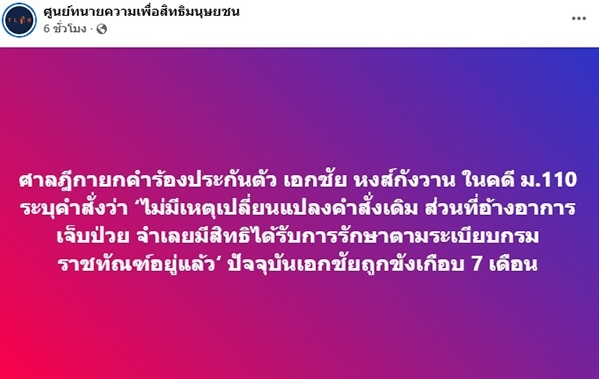 ศูนย์ทนายความเพื่อสิทธิมนุษยชน รายงานว่า ศาลฎีกายกคำร้องประกันตัว เอกชัย หงส์กังวาน ในคดี ม.110 จากเหตุที่ถูกกล่าวหาว่าร่วมกันขัดขวางขบวนเสด็จ ระหว่างเหตุการณ์ชุมนุม #ม็อบ14ตุลา ปี63 หลังจากที่ยื่นประกันไปเมื่อวันที่ 31 มี.ค. 69 ที่ผ่านมา