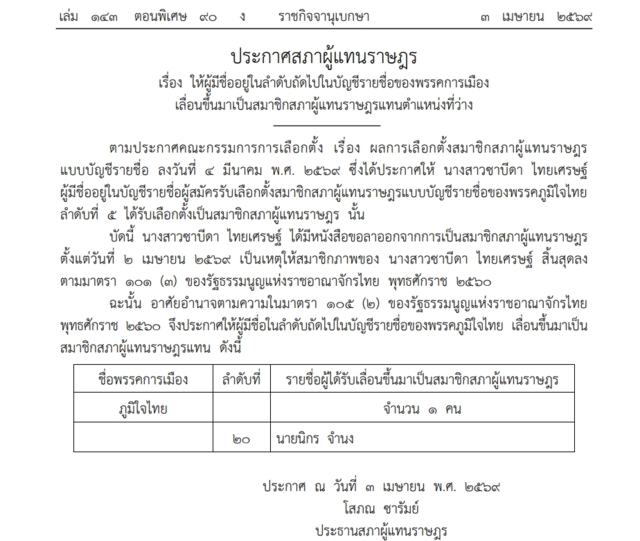 เมื่อวันที่ 3 เมษายน 2569 เว็บไซต์ราชกิจจานุเบกษาได้เผยแพร่ประกาศสภาผู้แทนราษฎร เรื่องให้ผู้มีชื่ออยู่ในลำดับถัดไปในบัญชีรายชื่อของพรรคการเมืองเลื่อนขึ้นมาเป็นสมาชิกสภาผู้แทนราษฎรแทนตำแหน่งที่ว่าง โดยสาระสำคัญของประกาศระบุว่า ตามที่ได้มีประกาศคณะกรรมการการเลือกตั้ง (กกต.) เรื่อง ผลการเลือกตั้งสมาชิกสภาผู้แทนราษฎรแบบบัญชีรายชื่อ เมื่อวันที่ 4 มีนาคม 2569 ซึ่งได้ประกาศให้นางสาวซาบีดา ไทยเศรษฐ์ ผู้สมัครในบัญชีรายชื่อลำดับที่ 5 ของพรรคภูมิใจไทย ได้รับเลือกตั้งเป็นสมาชิกสภาผู้แทนราษฎรนั้น