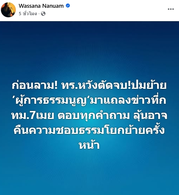 ล่าสุด วันที่ 5 เม.ย. 69 น.ส.วาสนา นาน่วม ผู้สื่อข่าวอาวุโสสายทหาร โพสต์ข้อความลงในเฟซบุ๊กเพจ “Wassana Nanuam” ระบุว่า ก่อนลาม! ทร.หวังตัดจบ!ปมย้าย "ผู้การธรรมนูญ" มาแถลงข่าวที่กทม.7เมย ตอบทุกคำถาม ลุ้นอาจคืนความชอบธรรมโยกย้ายครั้งหน้า